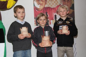 I weekenden den 26.-27. november dystede 180 børn og unge om danmarksmesterskaberene i skoleskak i Odense. Tre af AS04’s unge talenter – Andreas Skovgaard, Emil Skovgaard og Nicolai Kistrup - havde kvalificeret sig til at deltage, og de klarede sig alle flot. Særlig godt gik det for københavnsmester Andreas Skovgaard. I DM’s yngste gruppe, for de 7-8 årige, scorede han 7½ point ud af 9 mulige, og det rakte til en sølvmedalje blandt de 36 deltagere. DM-titlen blev reelt afgjort i 6. runde, hvor Andreas mødte Filip Boe Olsen fra Århus Kredsen. Det blev et langt og spændende parti, men det blev også Andreas’ eneste tabsparti i en turnering med et fantastisk godt samlet resultat. Også tvillingebror Emil Skovgaard var med i topstriden, og han sluttede på en femte-plads. Om lørdagen deltog Emil i DM i lynskak og opnåede en tredjeplads i gruppen for de 7-8 årige. I gruppen for de 9-10 årige blev det til en fjerdeplads til Nicolai Kistrup. Sidste år blev Nicolai danmarksmester for de 7-8 årige, og det kunststykke viste sig ikke muligt at gentage blandt mange spillere med ét års ekstra skakerfaring. AS04 ønsker Andreas, Emil og Nicolai et stort tillykke med de fortrinlige resultater. / Henrik Andersen